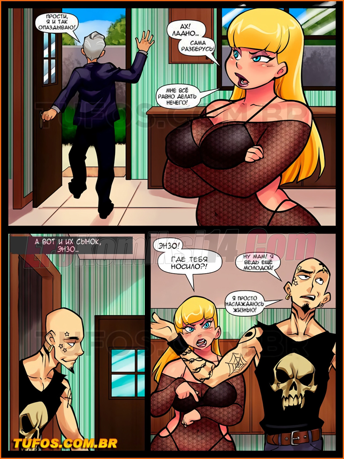 Порно комикс Сладкие домохозяйки. Часть 4. Знакомство с Лауной Развратная зрелая блондинка захотела заняться домашними делами пока мужа не было дома. Она вышла