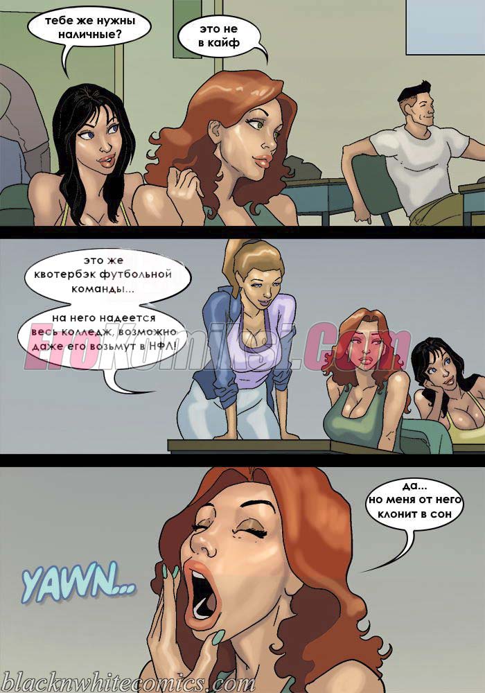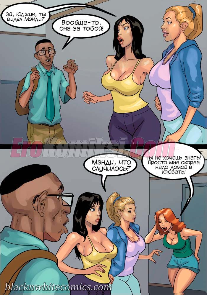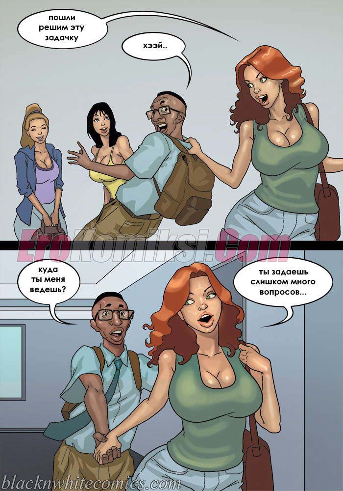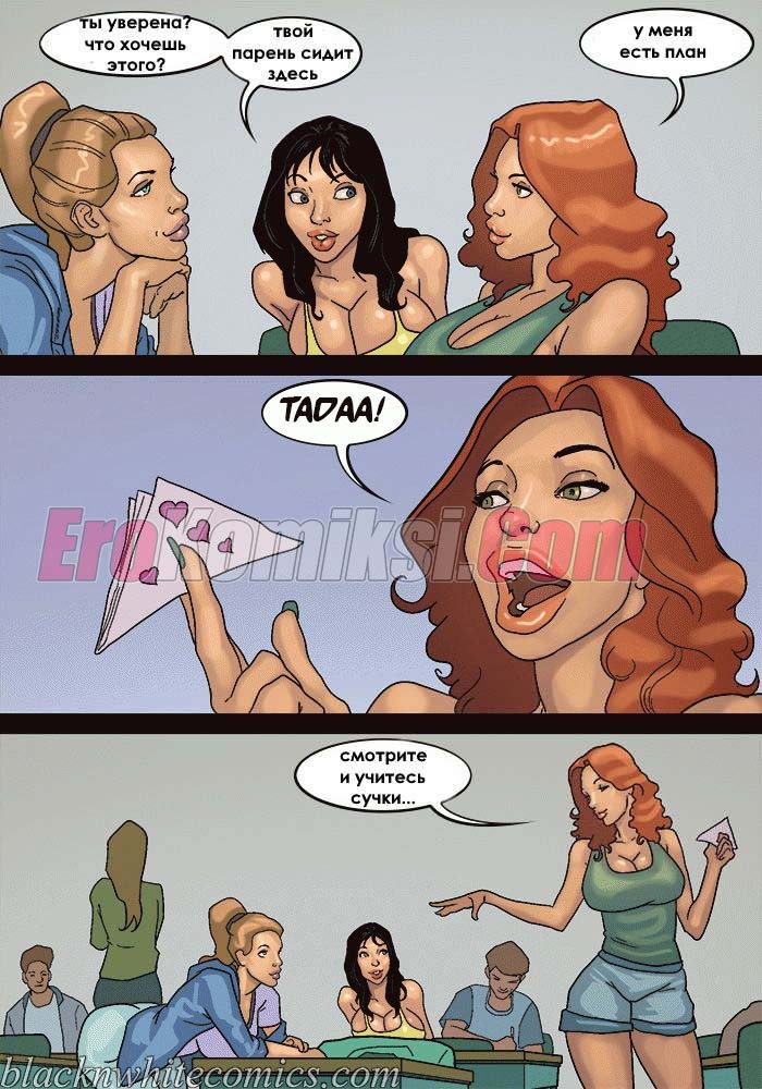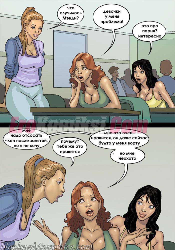 Порно комикс После уроков. Часть 3. Развратные девушки вновь донимают парня с большим хуем. Они вместе договариваются и сношаются в ним по очереди во время