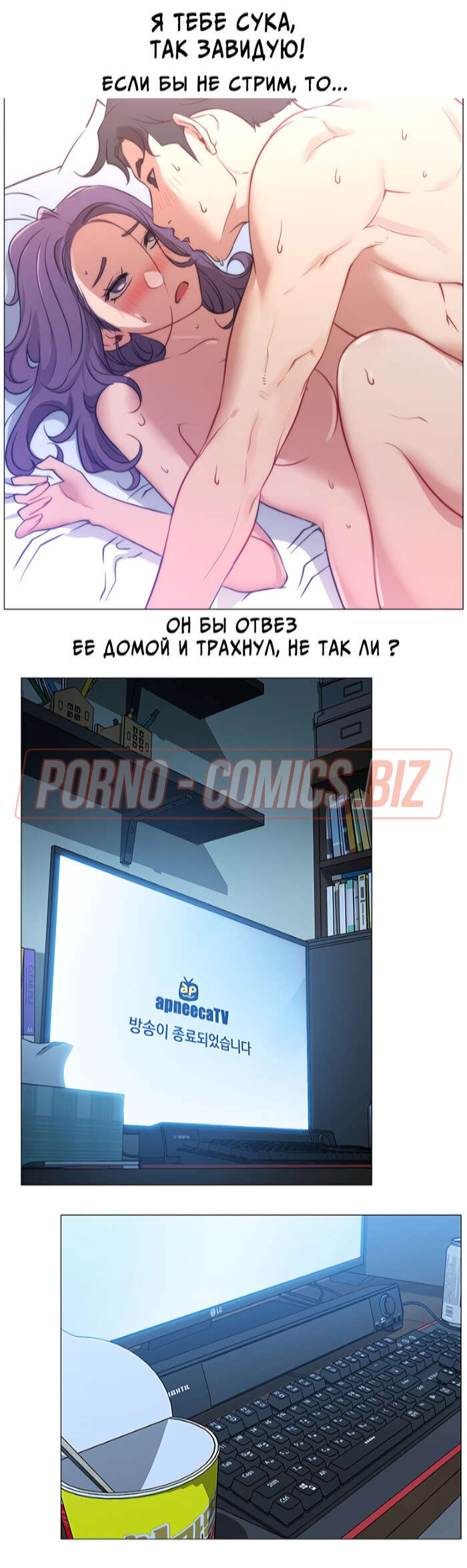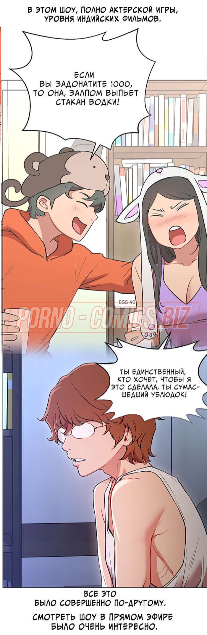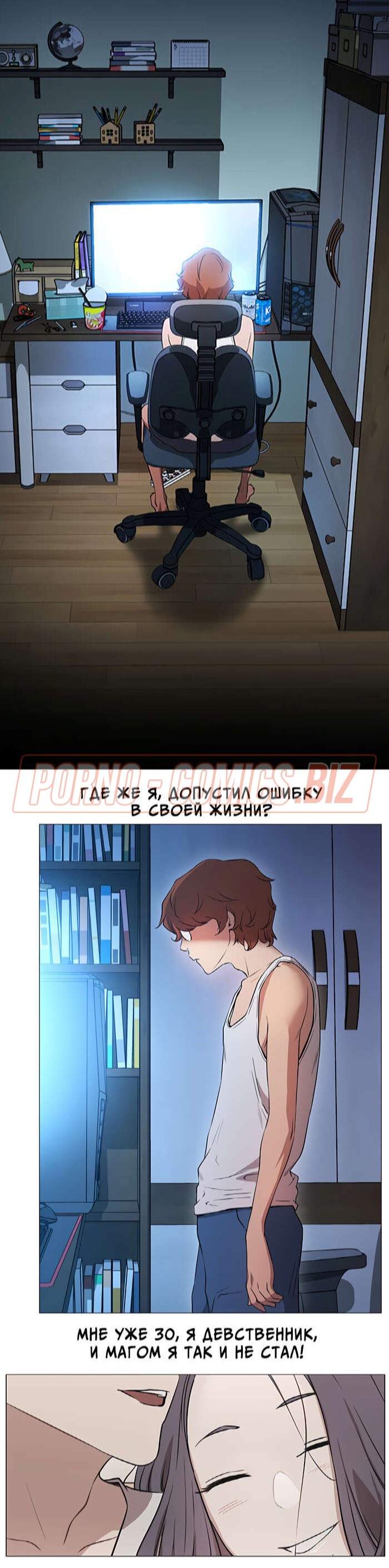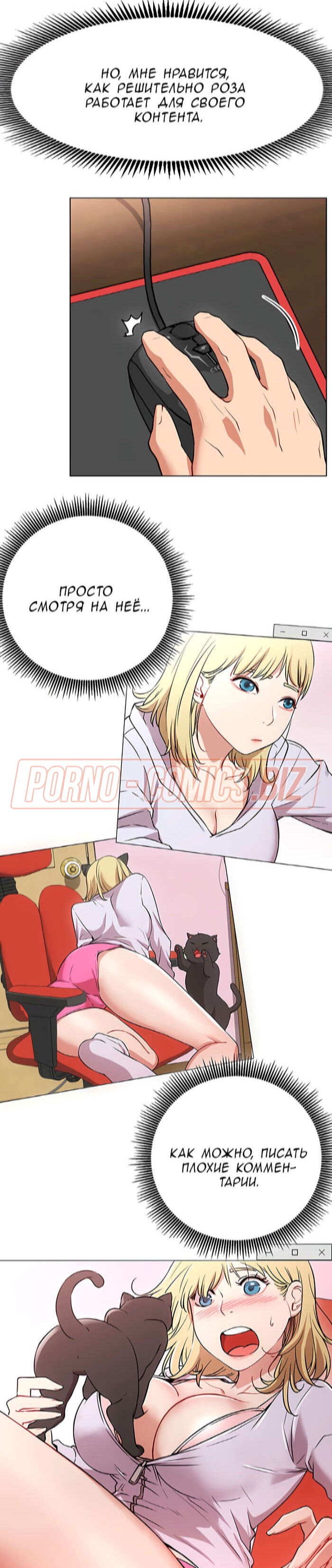 В первой главе возбуждающего порно комикса "В прямом эфире. Ты хочешь на стрим." молоденькая лоли, повернувшись в сторону, чтобы взять на руки своего кота, случайно засветила подписчикам красивую попку. Когда кот стал ее царапать, девушка умудрилась засветить еще и большие сисечки. Если бы она не была такой скромняшной, то смело бы показалась голенькой на стриме для своих фанатов.