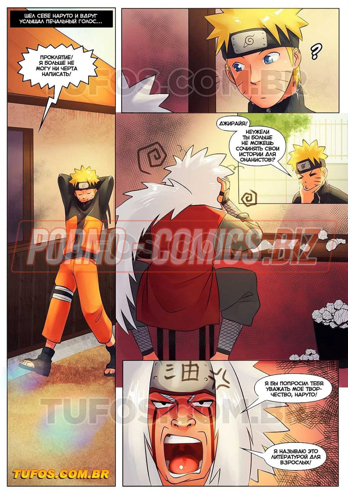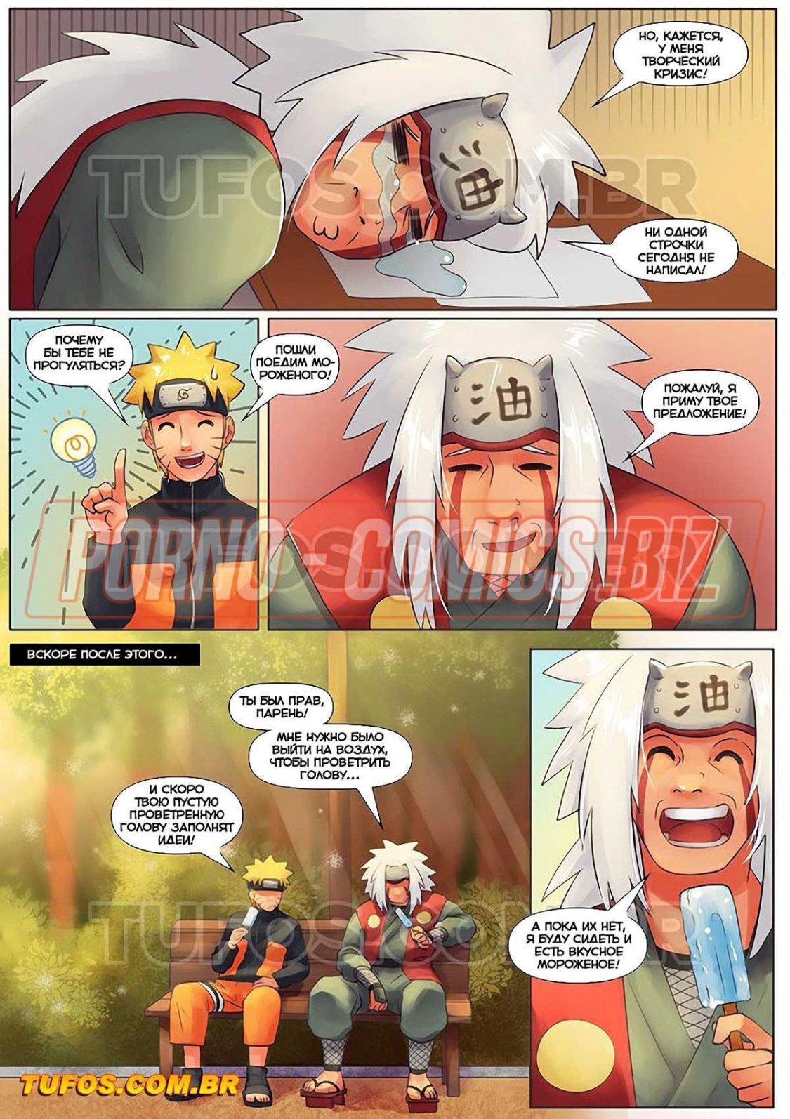 Во второй части комикса "Автор эротических книг" вы познакомитесь с красавчиком Наруто и творческой личностью Джираем. Узнав, что у седовласого развратника закончились эротические идеи, Наруто предлагает ему прогуляться. Скушав по мороженному, мужчины знакомятся с безумно сексуальными телочками. Если устроить с ними групповушку, Джирайя может быть сможет вернуть себе свое вдохновение.
