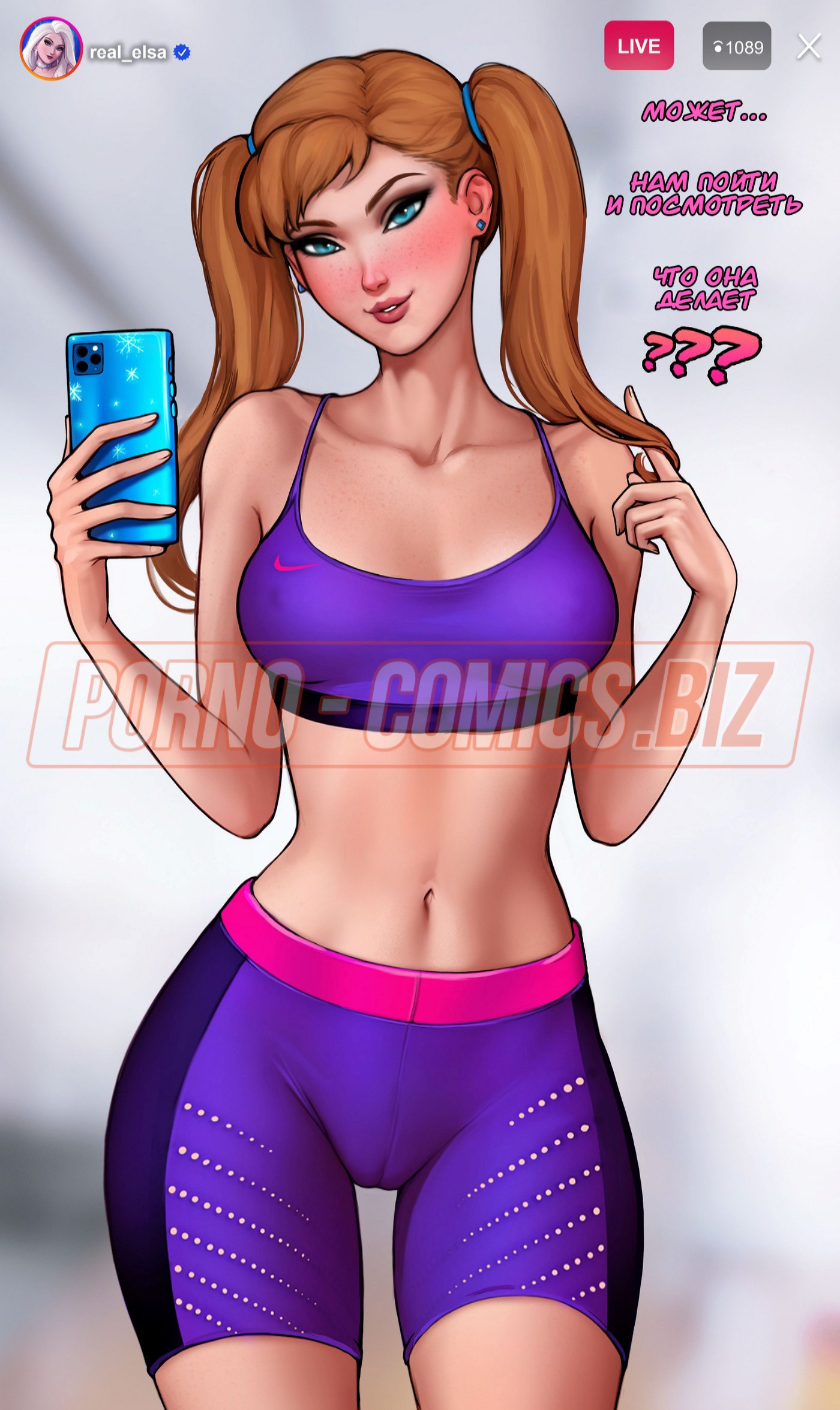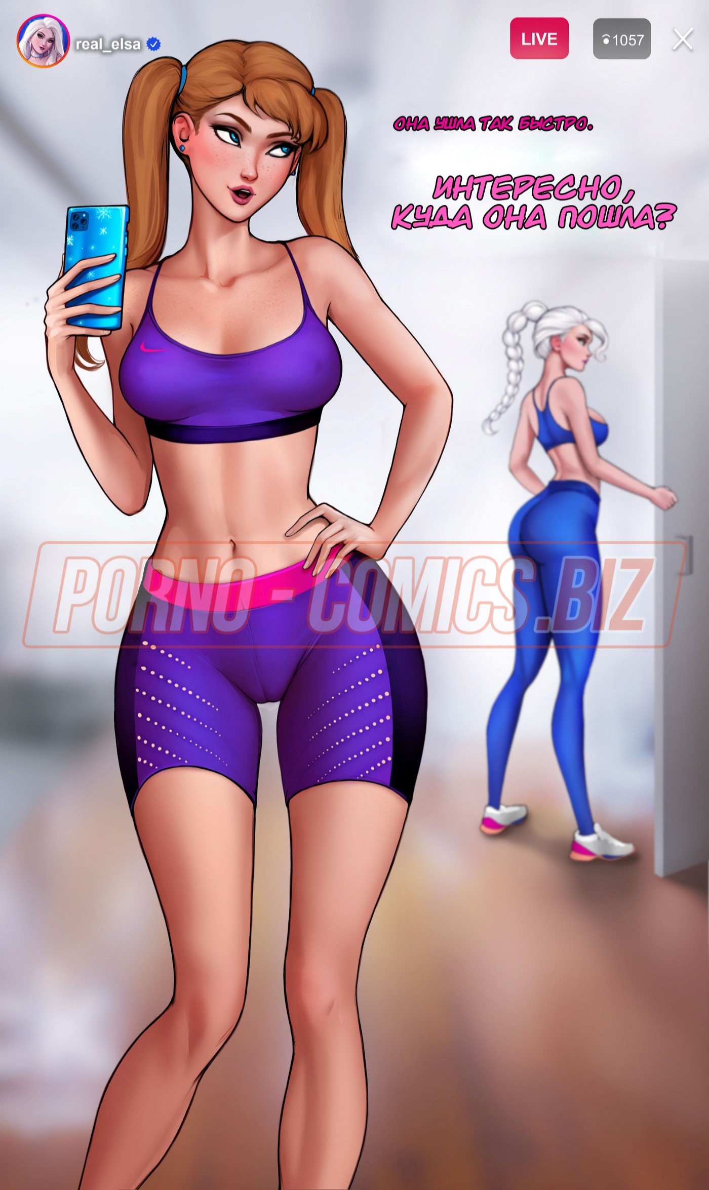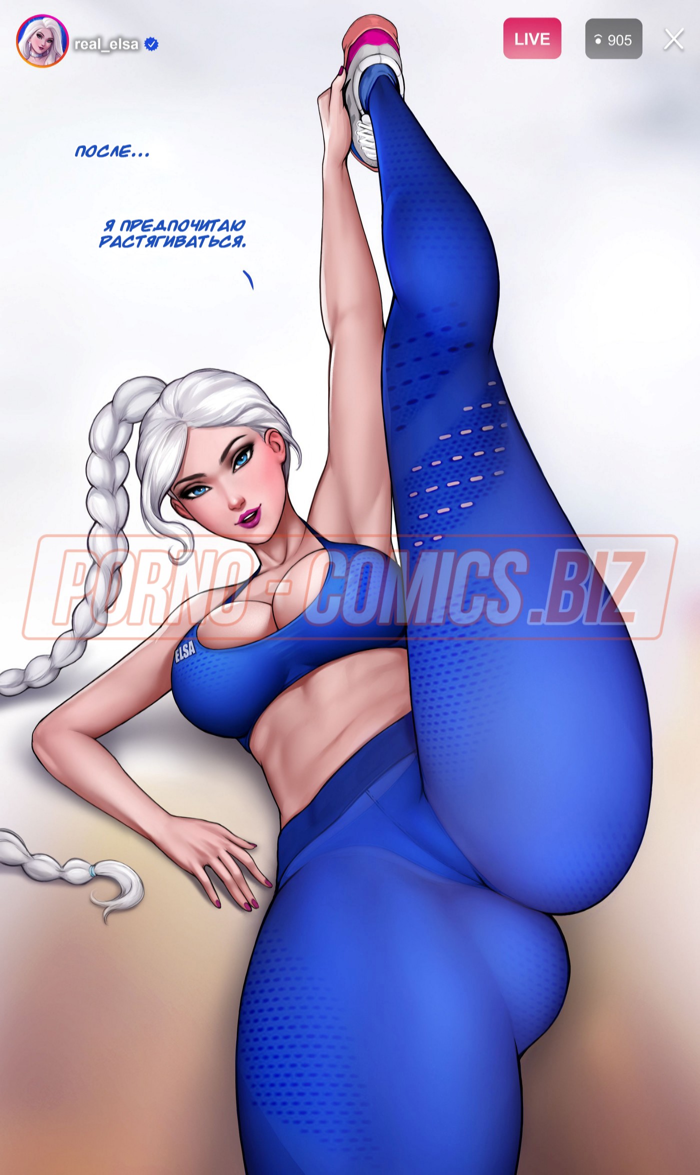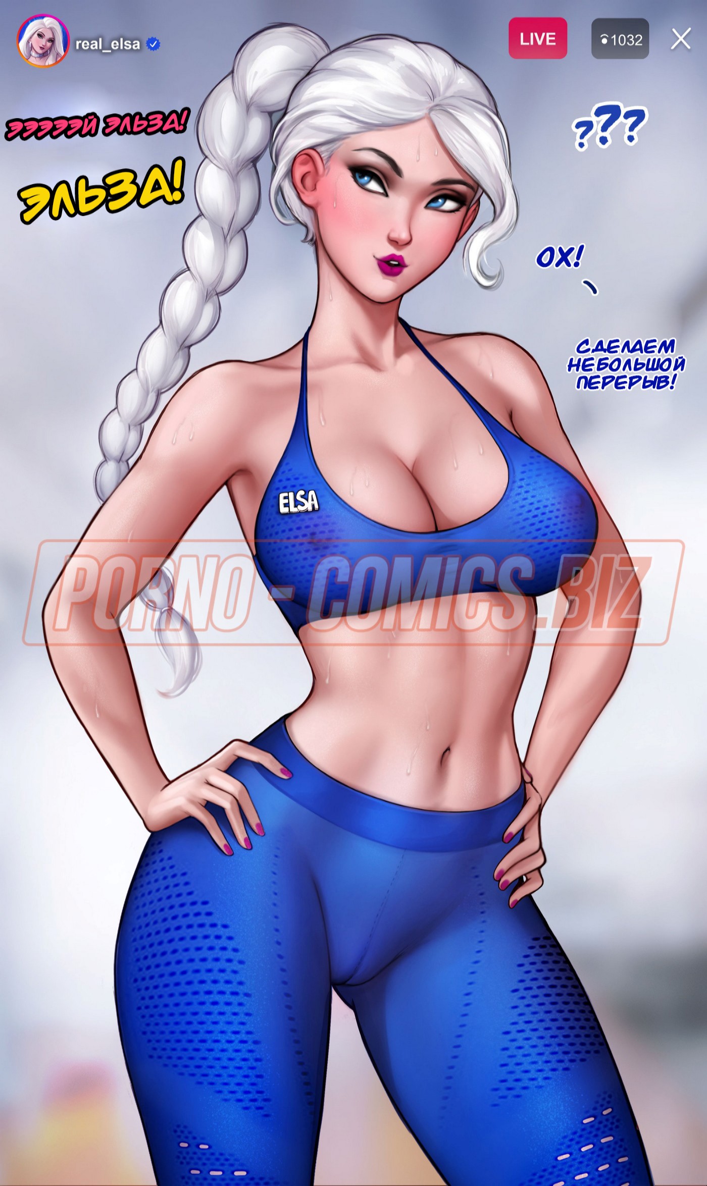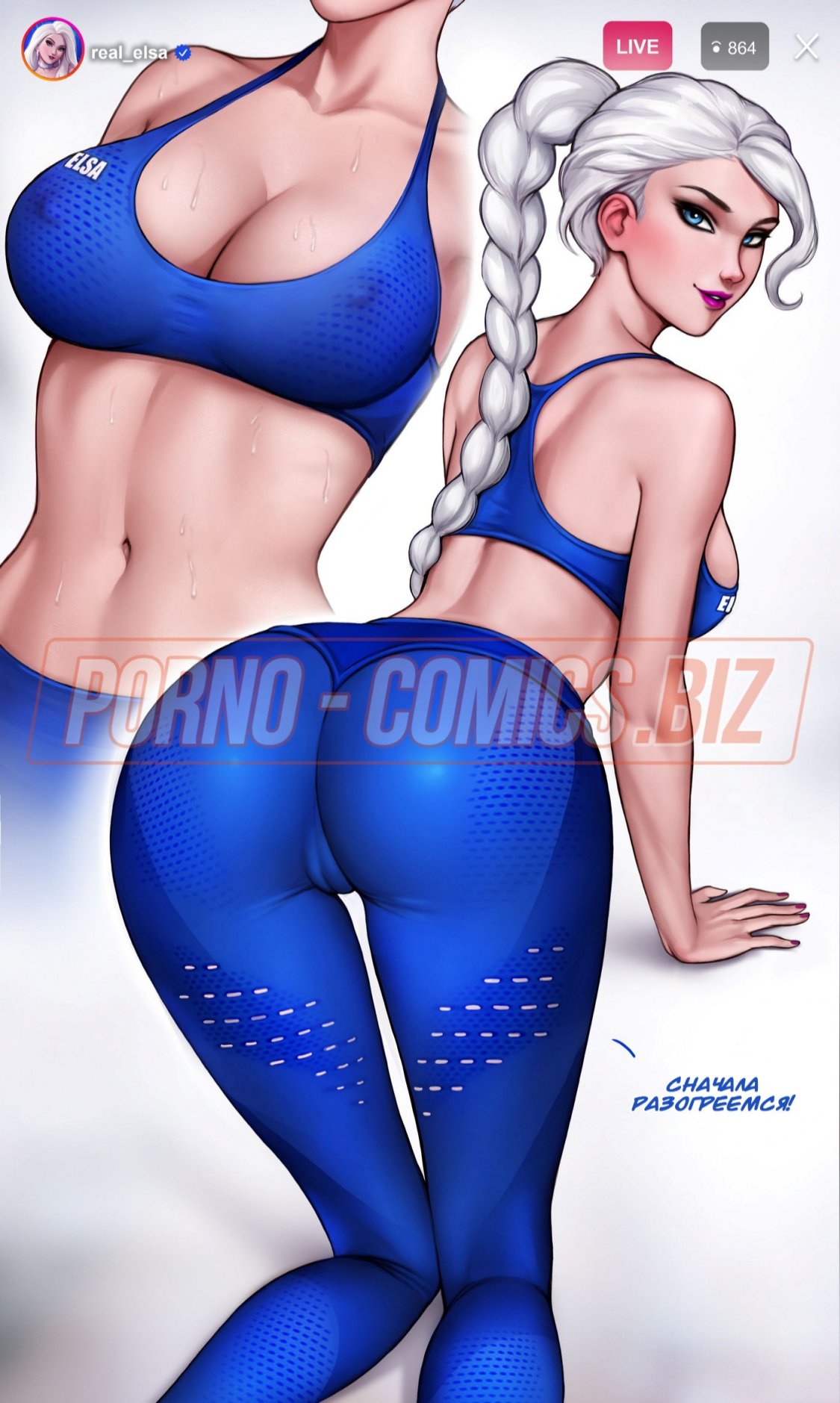 Смотрите секс комикс «Как тренировать свою задницу с Эльзой», где очаровательная принцесса, выйдя в прямой эфир, прокачивает свою пятую точку. Без сомнений, у всех ее зрителей текут слюнки при виде того, как Эльза приседает или задирает ножки. Когда тренировка заканчивается, Эльза решает пошалить со своим новым парнем. Она забывает выйти из прямого эфира, поэтому сосет член трахаря на всю страну.